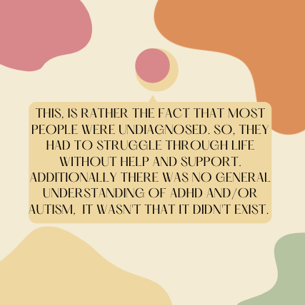 As years have gone by, we've learnt so much more about ADHD and Autism as well as so many other disabilities and just because these discoveries weren't available and researched before, certainly doesn't disregard their existence today. As more people were finally able to be diagnosed, the trends became clearer and correlations formed. I am thankful for these advancements as they shall lead to much more effective help to the many who need it. Open your eyes to the changes.